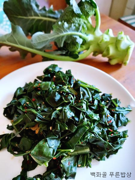남은 브로콜리 잎 부분은 채썰어서 끓는 물에 30초~1분 정도 살짝 데쳐주세요. 잎이 생각보다 부드러워 그렇게 오래 데치지 않으셔도 돼요. 찬물로 식힌 잎은 물기를 짜낸 뒤 양념에 무쳐서 상에 내면 끝인데요. 간장, 들기름, 다진 마늘, 깨소금으로 무친 것도 맛있고, 된장+다진 마늘+들기름+깨소금으로 무친 것도 맛있어요. 브로콜리잎 나물무침, 생각보다 간단하지요?